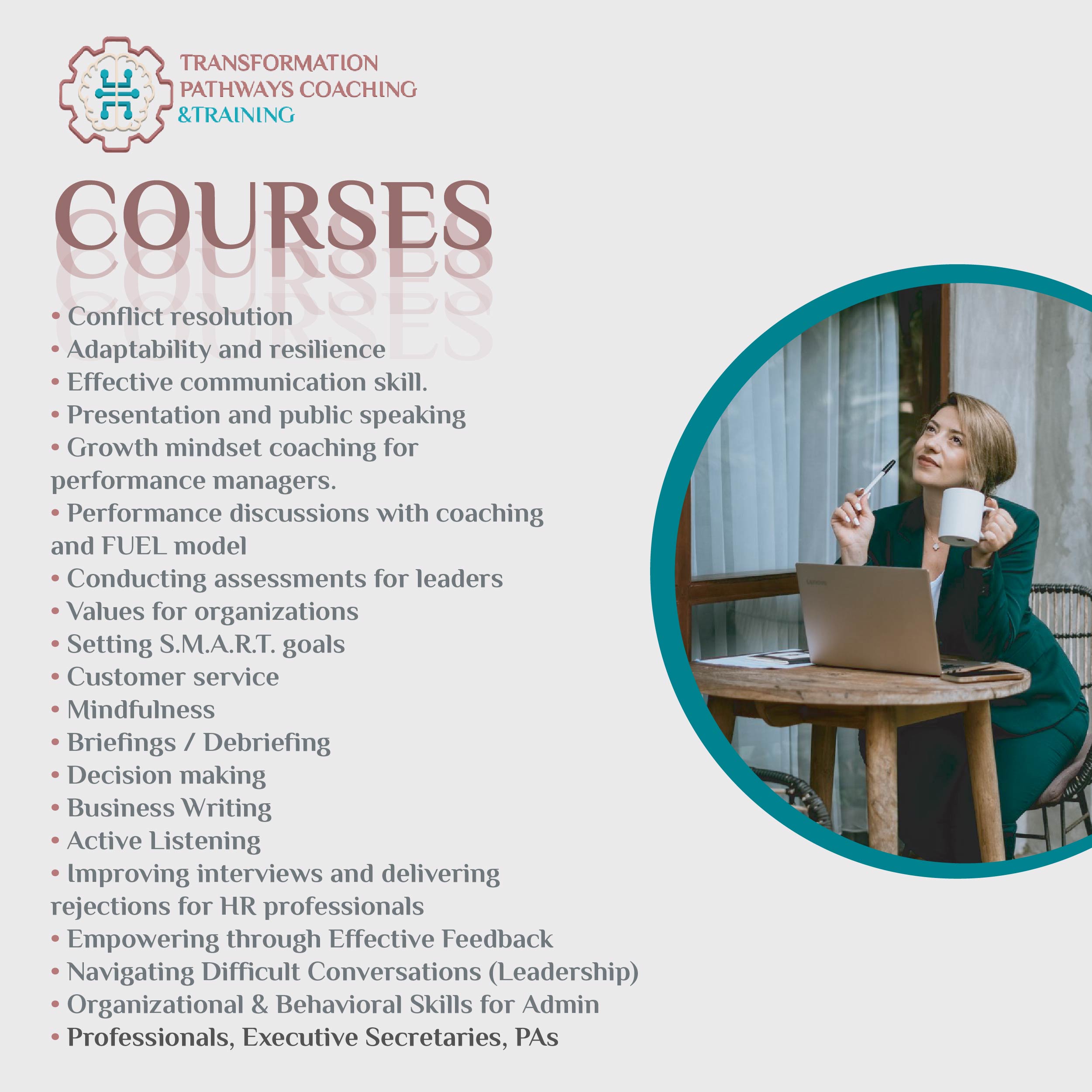 As I firmly believe that effective training and relevant workshops is an investment in personal and professional growth, I invite you to explore the various training and workshops programs and coaching packages I offer and discover how they can benefit you on your journey towards personal and professional fulfillment.